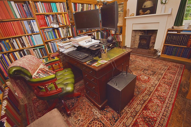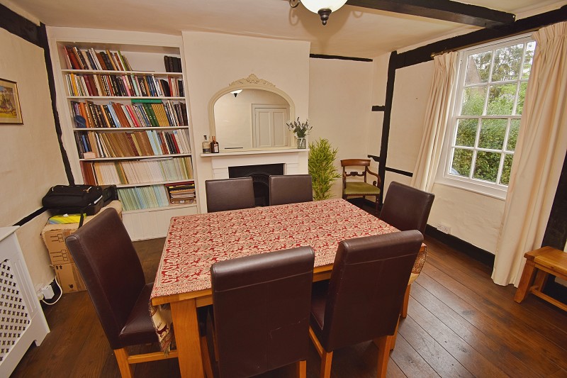 Exposed floorboards, good ceiling height,fireplace with stove, brick fire back and over mantel, custom fitted bookcases on three sides, one of which opens to reveal a large under stairs storage facility, windows to front and rear elevation.