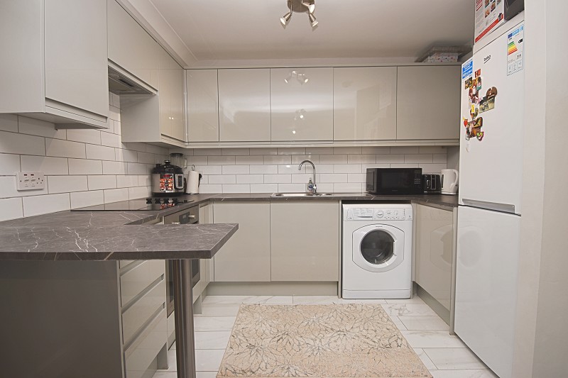 A stylish and well designed fitted kitchen with tiled flooring, sleek grey gloss soft close wall and base cupboards and drawer unit, plenty of worktop space, 4-ring electric hob, extractor fan above and oven below, one and quarter bowl sink unit with mixer tap and drainer, plumbing/provision for automatic washing machine, space for fridge freezer, part tiled splashbacks.