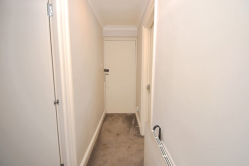 This neutrally decorated hallway comprises coved cornice ceiling, a contemporary style electric radiator to one side, doors that provide access to each room off.