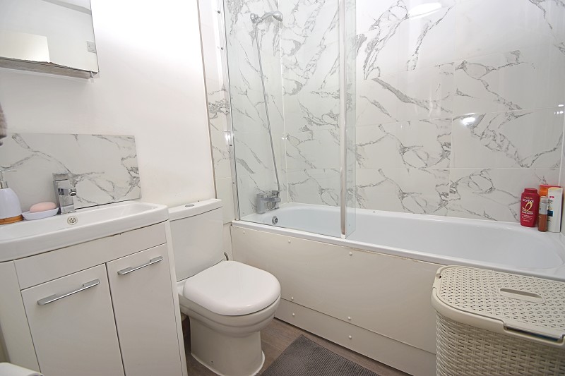 A smart contemporary bathroom comprising 3 piece suite in white and includes panel enclosed bath with mixer tap and hand held shower attachment, folding shower screen, vanity wash hand basin with mixer tap and storage beneath, close coupled wc, part tiled walls.