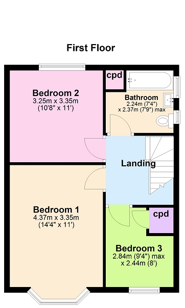 Bedroom 1 (14′ 04″ x 11′ 0″ or 4.37m x 3.35m)