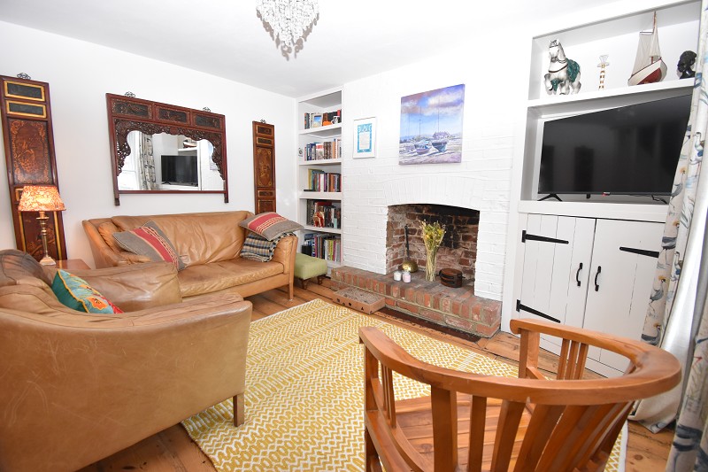 A charming lounge having a small pane double glazed style window to the front elevation with secondary double glazing, exposed arched brick fireplace with raised brick hearth and to either side custom fitted book/display shelving including a useful base cupboard for storage. Exposed strip wood floorboards, good ceiling height, low level double radiator.