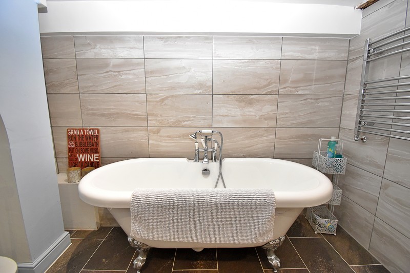 A fantastic space featuring a period style roll top bath on claw feet with a centre mixer tap and hand held shower attachment, low flush wc, pedestal and wash hand basin with twin taps, ceiling downlights, chrome upright ladder style radiator towel rail, utility cupboard which conceals plumbing/provision for automatic washing machine..