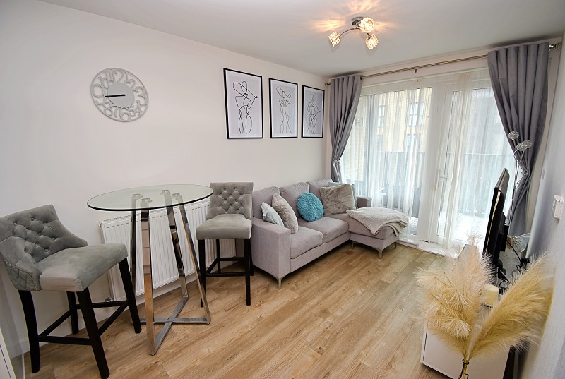 The living/dining area comprises: Amtico sun bleached flooring, down lighters, a double radiator, a wall mounted central heating thermostat, a double glazed full height window and door that opens out on to the private balcony