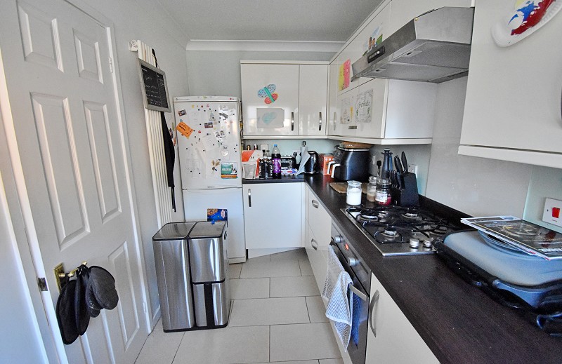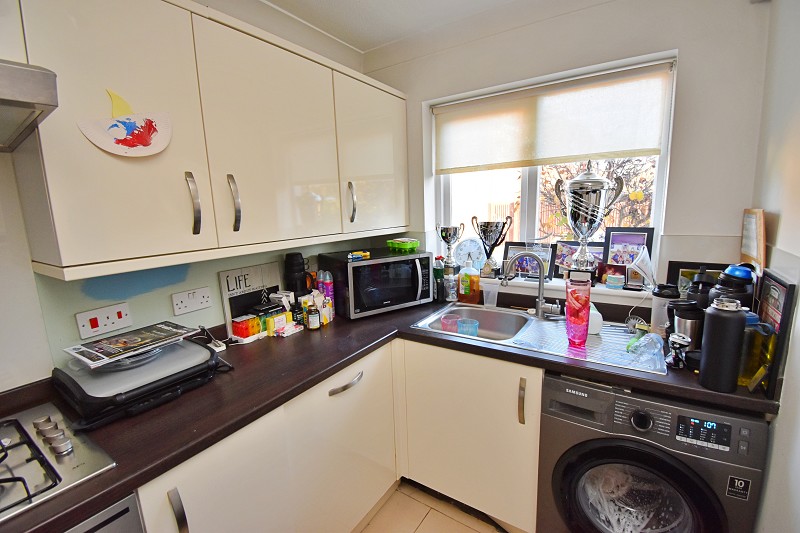 Range of fitted wall and base units in a matching design incorporating electric oven, 4 ring gas hob above, single bowl sink unit with mixer tap and drainer, space for fridge freezer, plumbing/provision for automatic washing machine, upright contemporary style radiator to one side. Double glazed window to the front elevation.