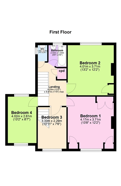 Bedroom 1 (13′ 08″ x 12′ 02″ or 4.17m x 3.71m)